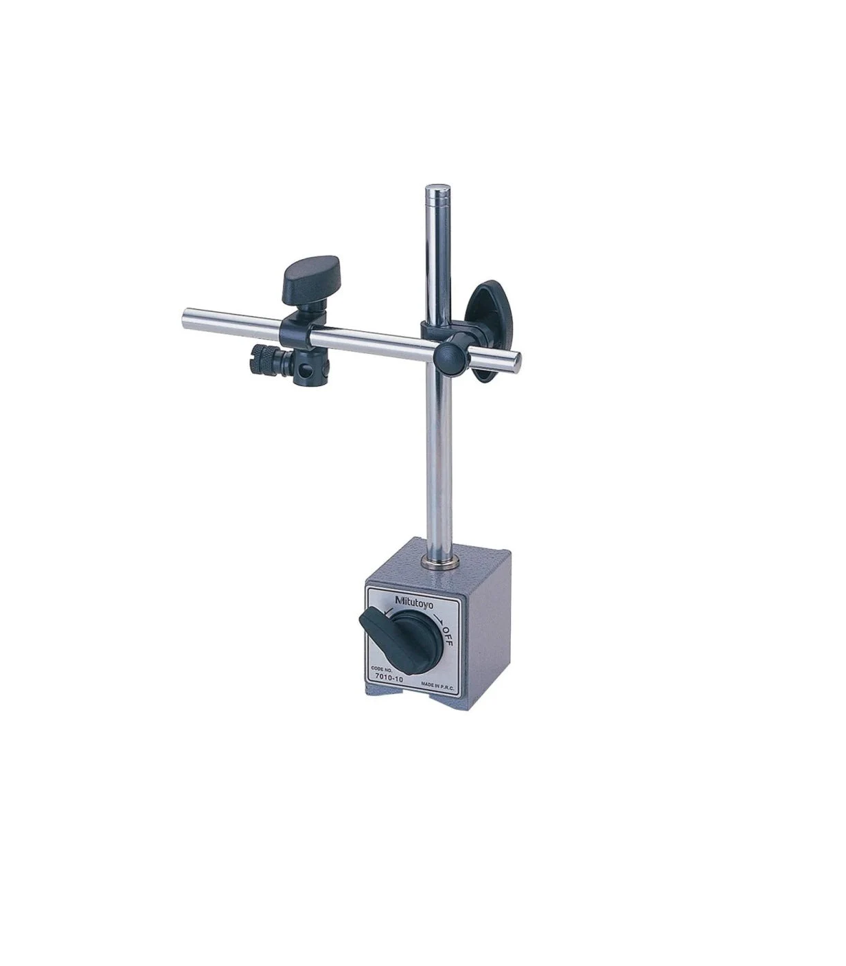The Mitutoyo 7010S Magnetic Stand comes with a 6″ rod and universal clamp. It is compatible with all AGD-type dial indicators, test indicators, and probes featuring 0.375″, 6mm, or 8mm diameter shanks, as well as lug backs with 1/4″ diameter mounting holes. The convenient On/Off switch ensures quick mounting and dismounting without damaging the indicator or work surface. With a strong 132 lbf magnetic force, this stand provides secure stability and reduces the risk of indicator or probe damage from accidental base tip-overs.