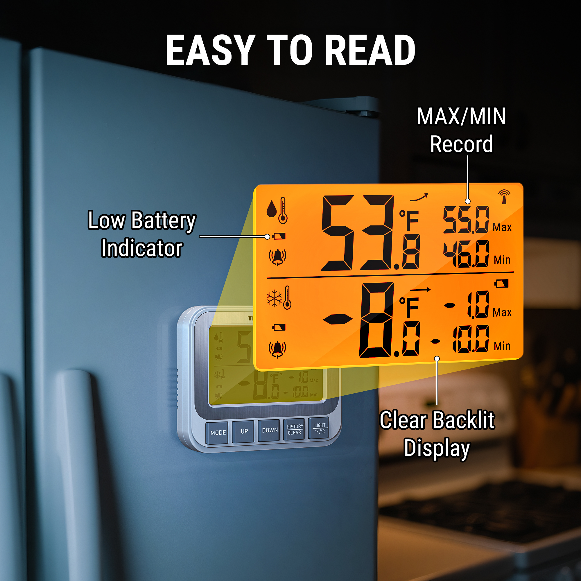The oversized LCD screen with bright backlight ensures easy readability, even in dark freezers or low-light conditions. Say goodbye to squinting while checking your fridge temperature with our freezer Thermometer