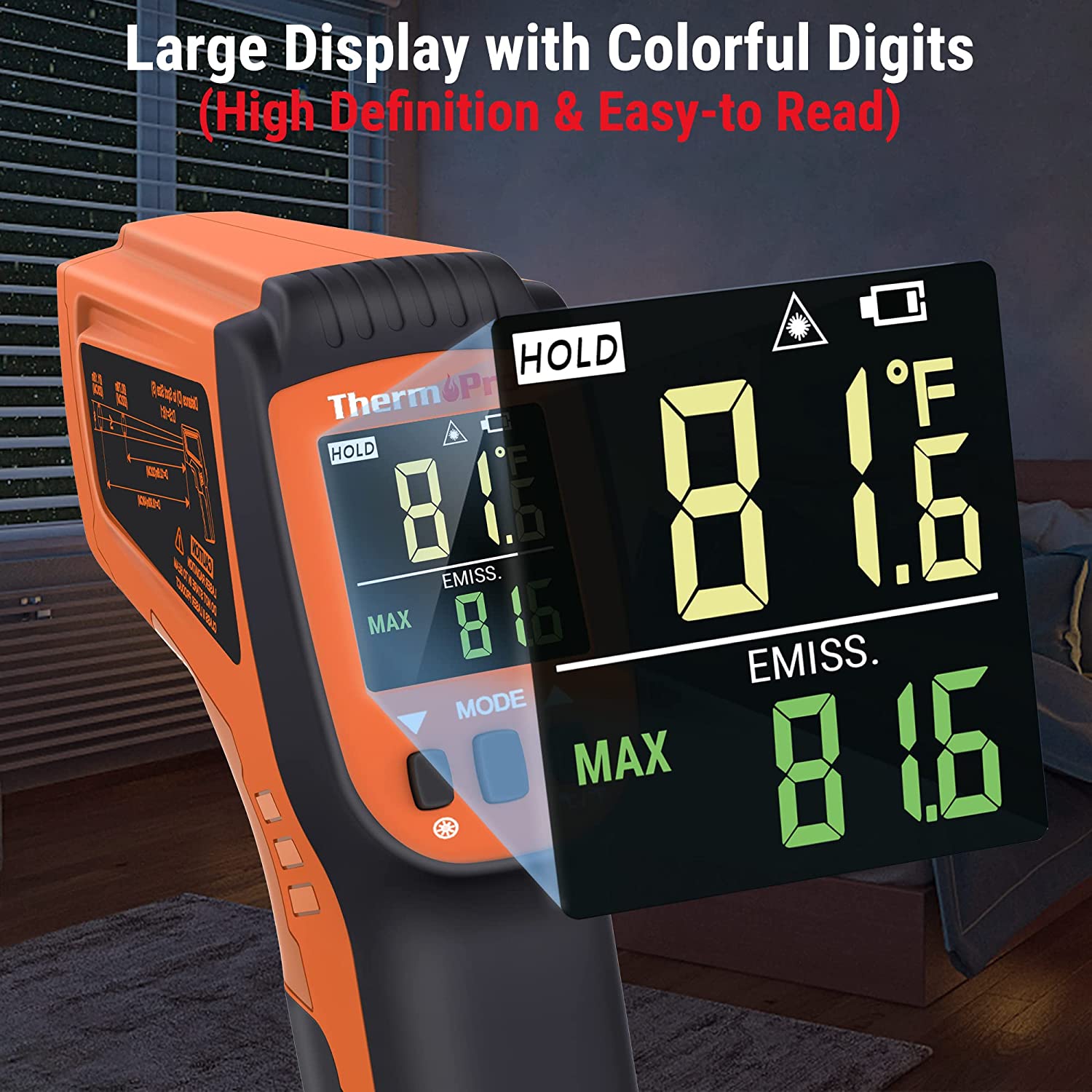 - 【Colorful Display with Large Digits】 Built in the latest LCD technology, this thermometer for cooking displays reading with large colorful digits on 1.58-inch ultra-clear BTN panel; Thermal gun with bright display remains fully legible even under dim conditions