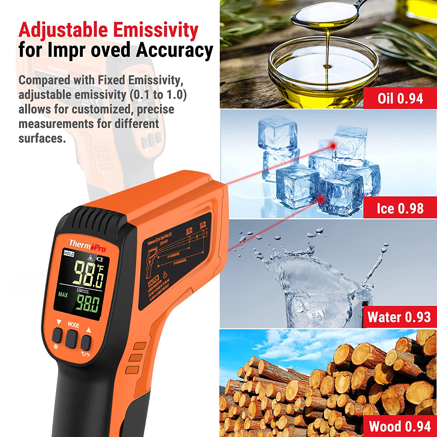 - 【Safer Distance & Better Accuracy】With the latest thermopile technology and a distance-to-spot ratio of 16:1, this ir thermometer gun allows you to read temps at longer, safer distance than ever before; Adjustable emissivity from 0.1 to 1.0 provides measurement accuracy across different surface types highly up to ±1.5%
