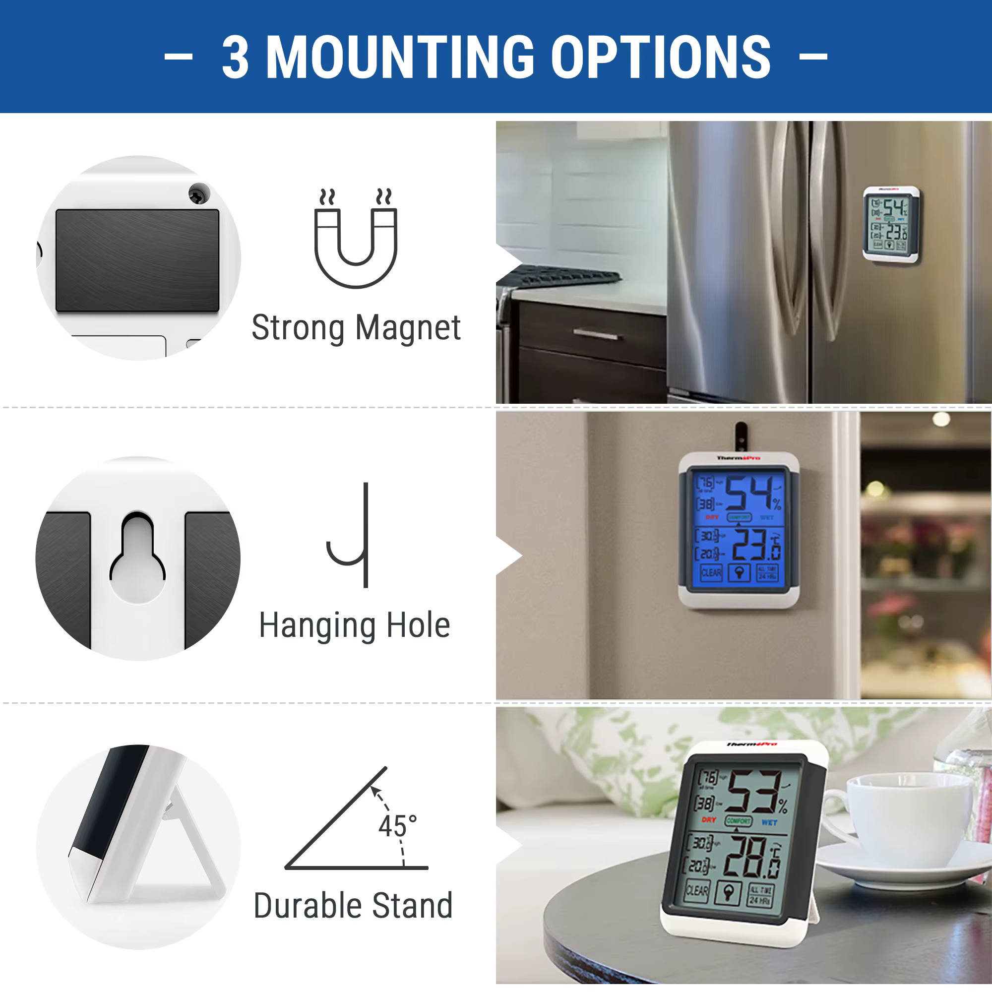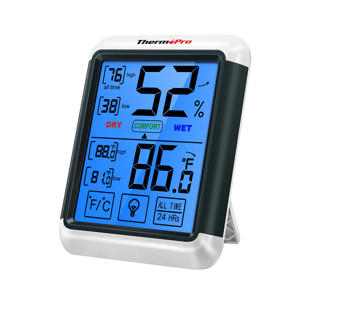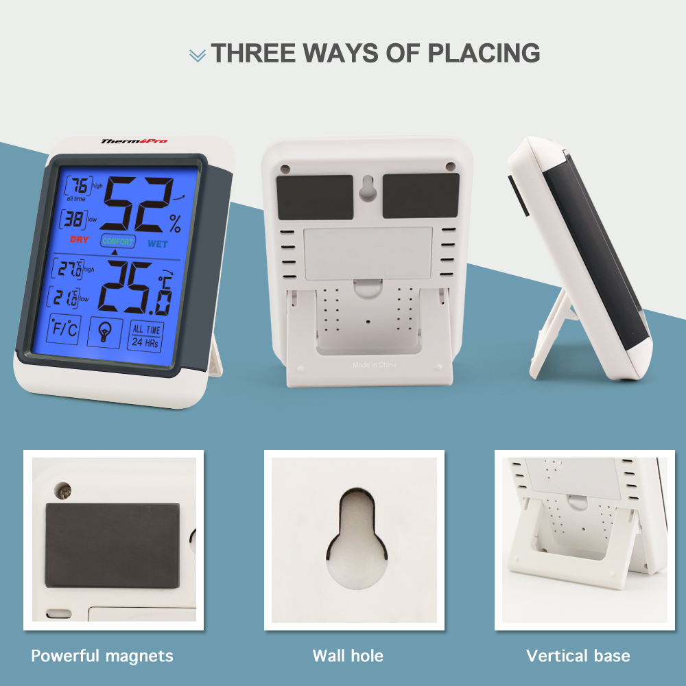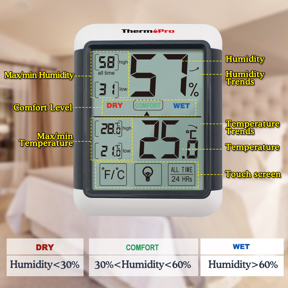 Further, no need to remove the device off your wall or fridge to switch settings, simply to use the touch screen display. Additionally, TP55 provides an ample amount of valuable information, for instance, displaying 24 hour/all-time high/low records and current trends for both humidity and temperature, and lastly, humidity level icons that indicate that your household is too humid, too dry or just right.