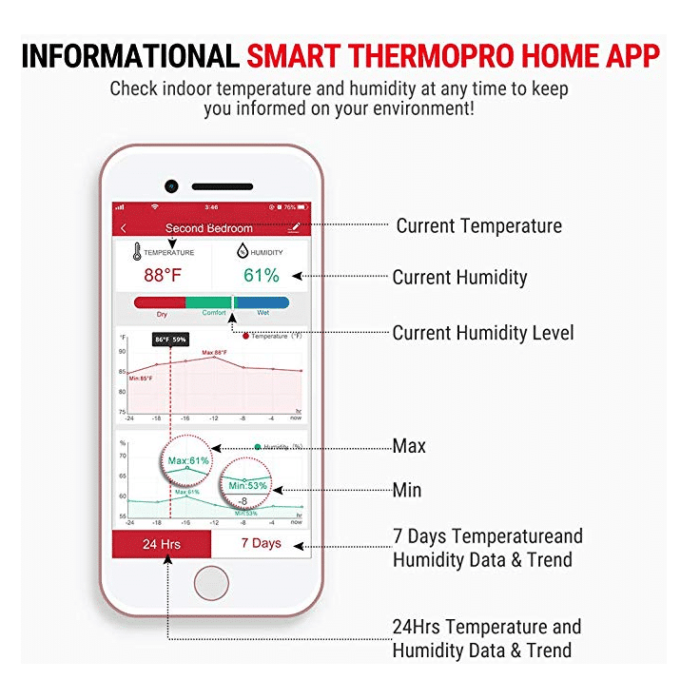 ThermoPro WIFI remote sensor not only quickly and accurately broadcasts the current temperature and humidity of each room, it allows you to be able to conveniently look up historic temperature and humidity readings from any location via an APP installed on your cellphone.