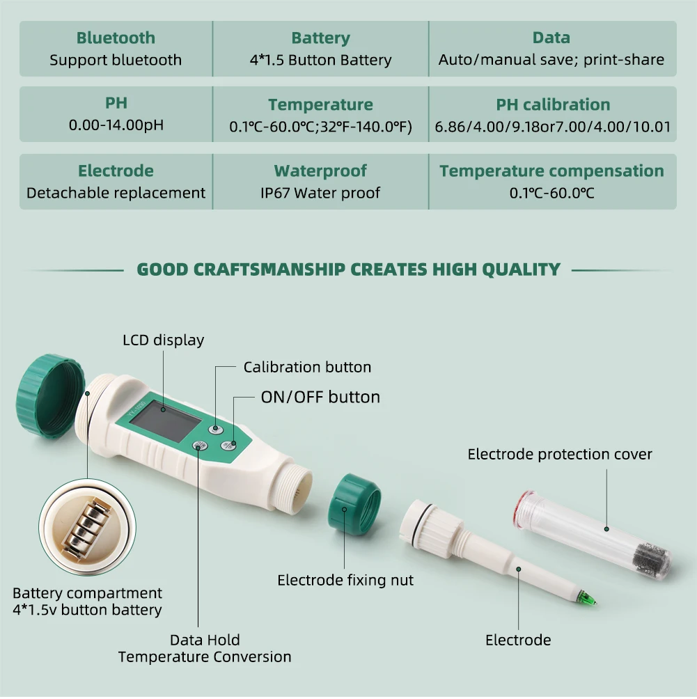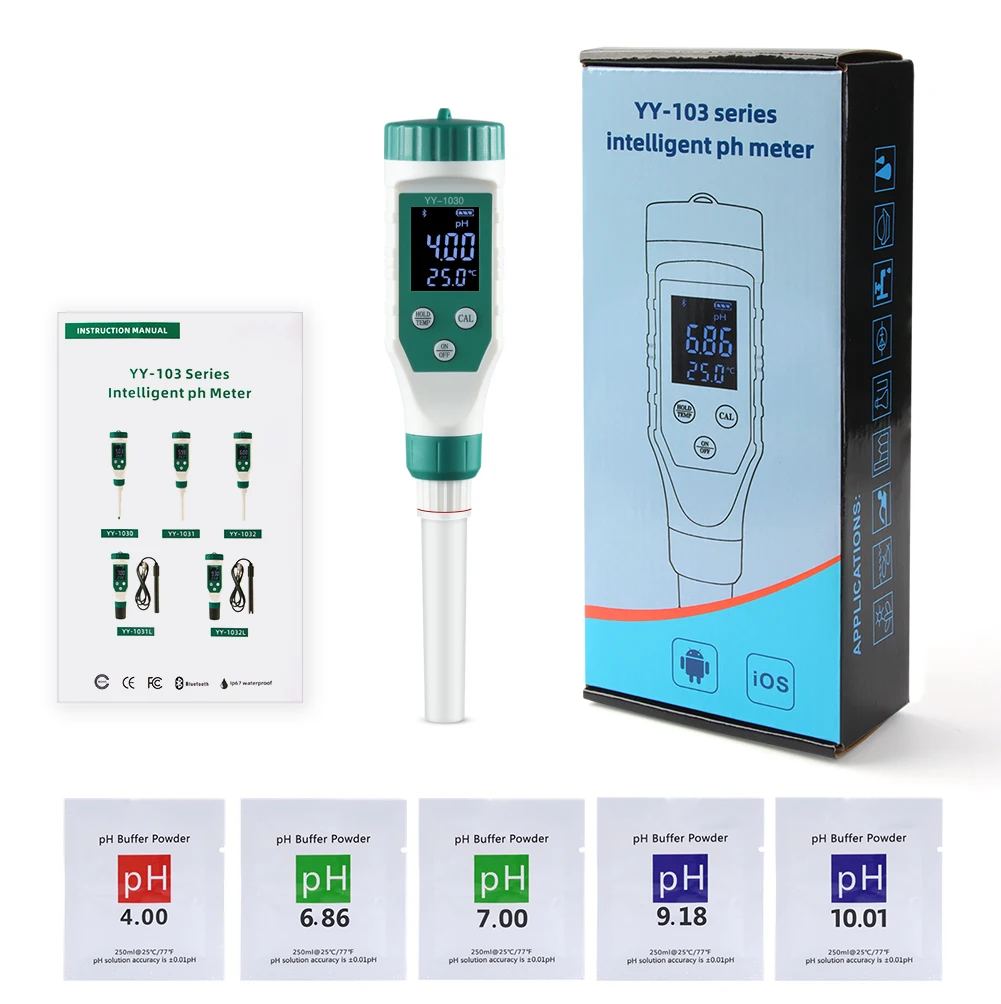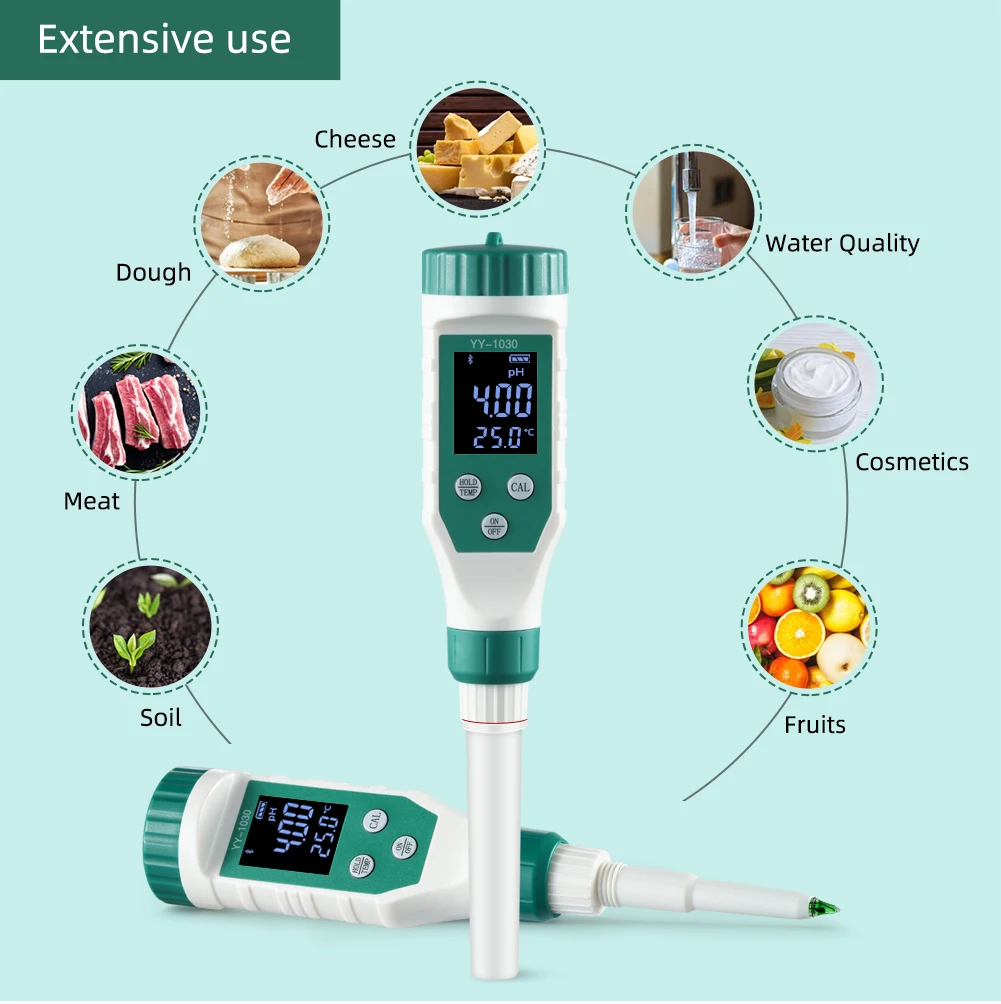 pH Meter with Bluetooth: pH meter is suitable for testing the pH of soft solid samples with high precision, such as dough, succulent, cheese, etc, and also suitable for routine pH tests of an aqueous solution.